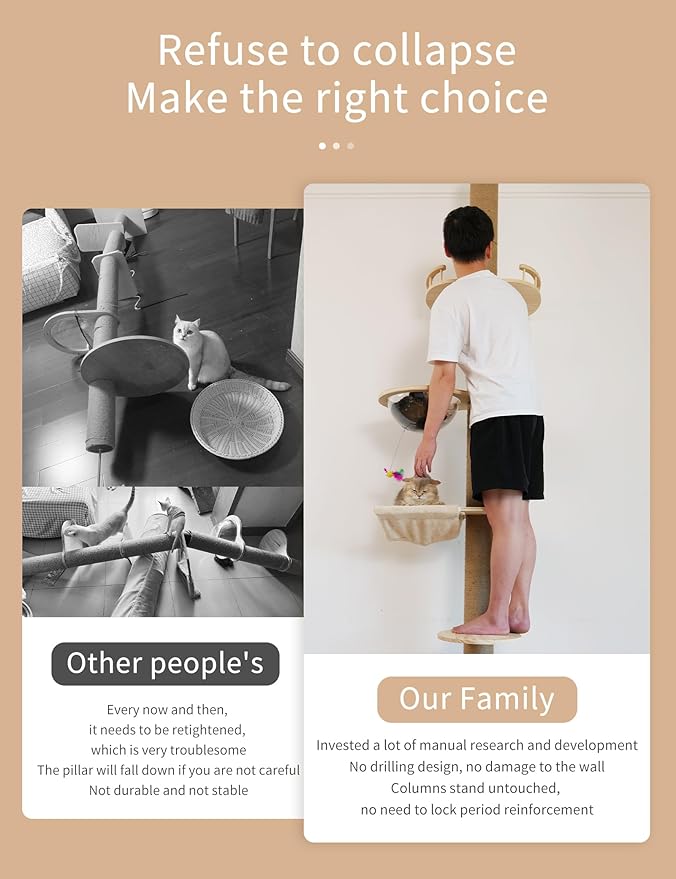 - The Floor to Ceiling Cat Tower eliminates the need to drill holes in the ceiling walls, and the new design of the top 3 support rods can hold up to 140 pounds for a more stable tower. No need to worry about an unsteady fall, resulting in cat injuries and furniture damage!