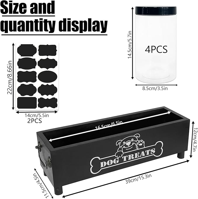 - Super Capacity Treats Storage Container: Our dog food storage container measures 15.3 inches (L) x 4.5 inches (W) x 4.7 inches (H), which is equipped with 4 high capacity food plastic jars and 20 blank labels, enough number of food plastic jars can satisfy your daily needs, and the blank labels can be well categorized to store a variety of pet-friendly snacks, such as dog food, cat food, snacks or cookies.
