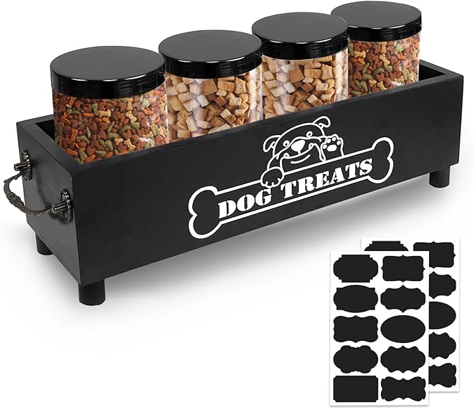 Large Dog Treats Container, Dog Cookie Jar for Dogs Cat Treats Container, Farmhouse Wood Pet Treats Storage Organizer for Dog Food Storage Container with 4 Jars, Cat Dog Treat Organizer