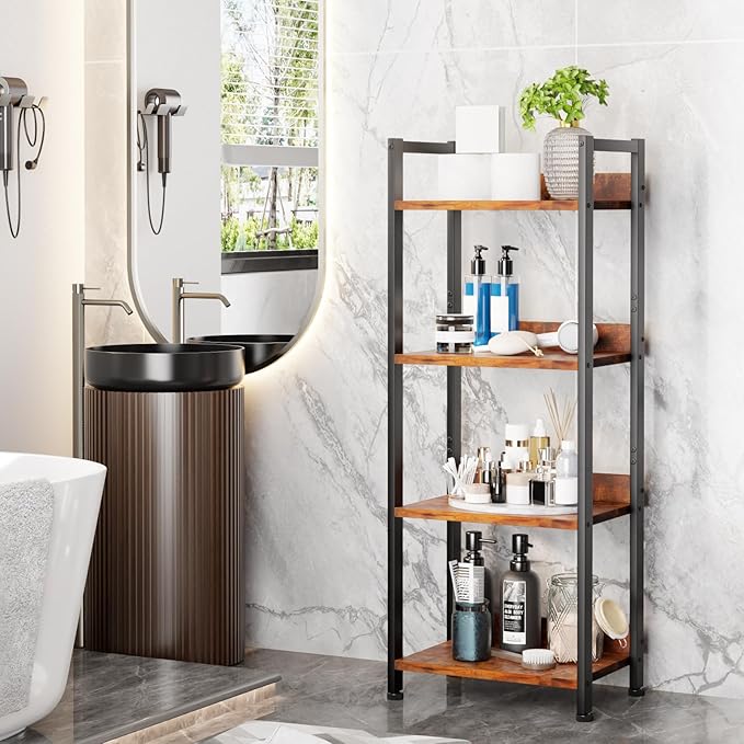 - [Space Saving]: This industrial bookshelf has 4 shelves. Its compact and lightweight design means that it takes up a small floor space. You can use this freestanding shelf to put your favorite books, crafts, photo albums, potted plants, etc. Perfect to store or display your necessities and decorations.