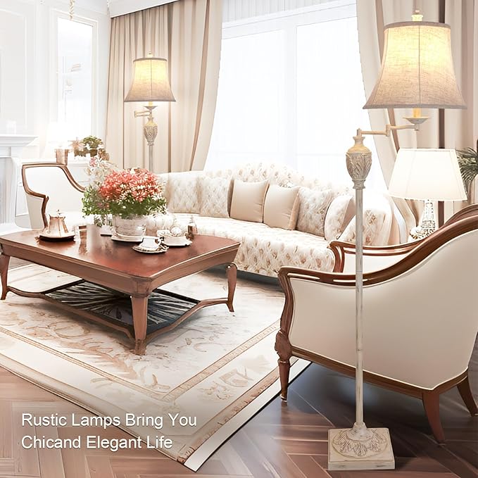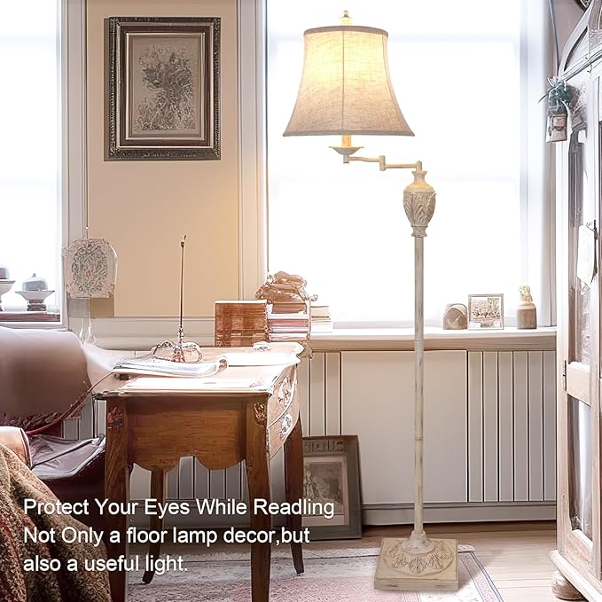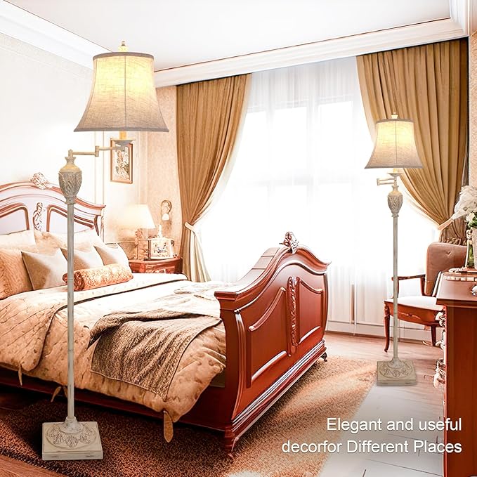 Traditional LED Floor Lamp with 350° Adjustable Swing Arm Lamp – Vintage Pole lamp Swing arm for Living Room, Bedroom and Office – Rustic Upright Floor Light for Home Décor with Faux Silk Fabric Shade