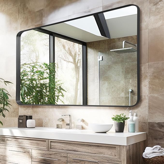 - Matte Black Metal Deep Framed Bathroom Wall Mirror: The frame is constructed of aluminium alloy, itβs more light-weighted and easy to be hung up. The premium quality aluminum alloy is solid and durable, waterproof and non-rusting in wet environments, sturdy frame with the protective round corners ensure a long time use