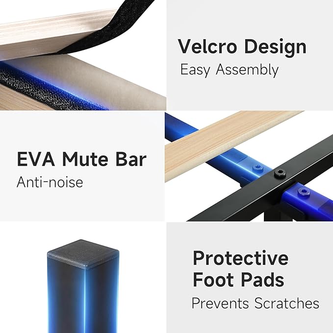 - 【Solid and noiseless 】The bed frame consists of a heavy metal frame and 12 solid wood slats, A pull bar in the middle of the headboard makes the bed frame more stable, Eight support points can support up to 1,000 pounds, effectively extending the life of the bed frame. Solid wood slats with Velcro and EVA mute bar, effectively avoid the noise caused by the friction between wood and metal frame, will not squeak, ensure your sleep quality!