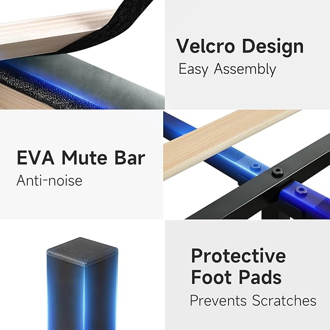 - 【Solid and noiseless 】The bed frame consists of a heavy metal frame and 12 solid wood slats, A pull bar in the middle of the headboard makes the bed frame more stable, Eight support points can support up to 1,000 pounds, effectively extending the life of the bed frame. Solid wood slats with Velcro and EVA mute bar, effectively avoid the noise caused by the friction between wood and metal frame, will not squeak, ensure your sleep quality!