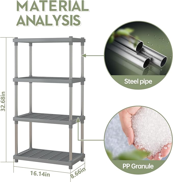 - 【Perfect Size】Product size:16.14*8.66*32.68 IN(41*22*83cm),metal pipes+plastic mesh shelves,simple and durable,easy to assemble.Kindly note that this is 4-tier gray shelves,no foot covers.If any inquiries,feel free to contact us.