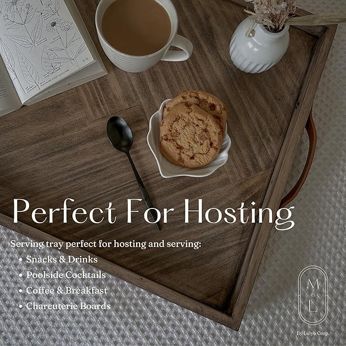 - Beautiful and Classical Design- LUIYO Large Ottoman Serving Tray which is perfect as a choice for serving food and drinks anywhere in the house. The leather handle with strong and classic joints helps to make it sturdy and beautiful.