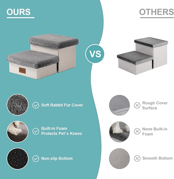 - 【Dog Stair with Storage】NOTE: The stairs are designed for small pets. Each step features a convenient storage space, perfect for storing pet toys, clothes, snacks, and any other pet supplies or accessories. Each step is less than 5 inches high, making it especially suitable for puppies or pets with knee injuries. NOTE: Be sure to verify that the size of the dog stairs is appropriate for your needs before purchasing.