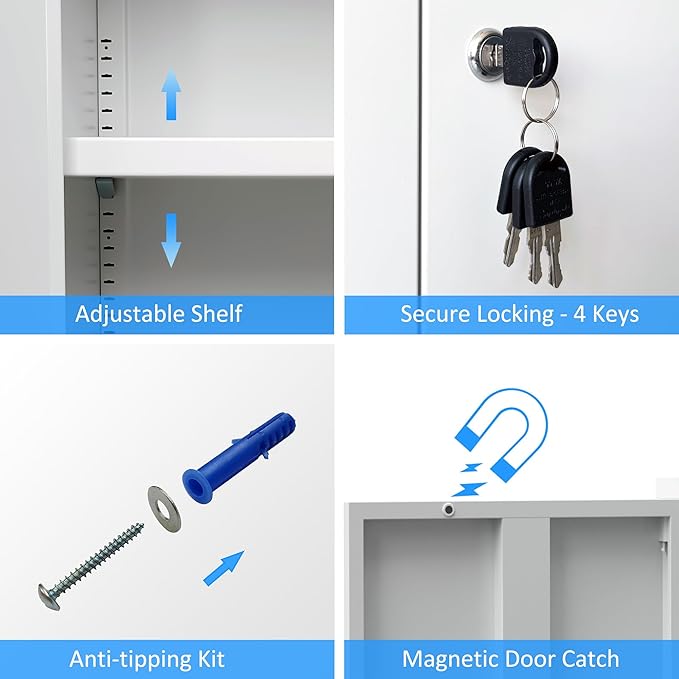- LOCKABLE DOORS - This metal storage cabinet features locking doors with 4 keys, the cabinet is also fitted with door catch to keep the doors closed when it is unlocked