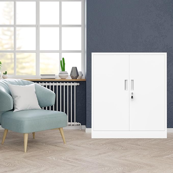Metal Storage Cabinet with Locking Doors and 2 Adjustable Shelves, Small Lockable Storage Cabinet for Home Office Garage (White)
