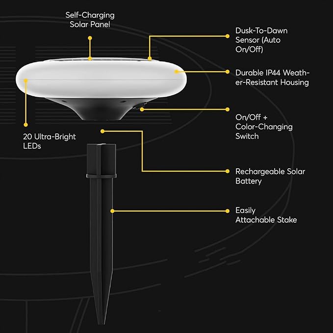- Beautiful Light Effect -- The LED outdoor solar lights come in 7 colors,provide a very beautiful halo.It can not only keep one color constantly, but also 7 colors to change interactively.It have red, green, blue, yellow, purple, cyan, white, 7 colors.