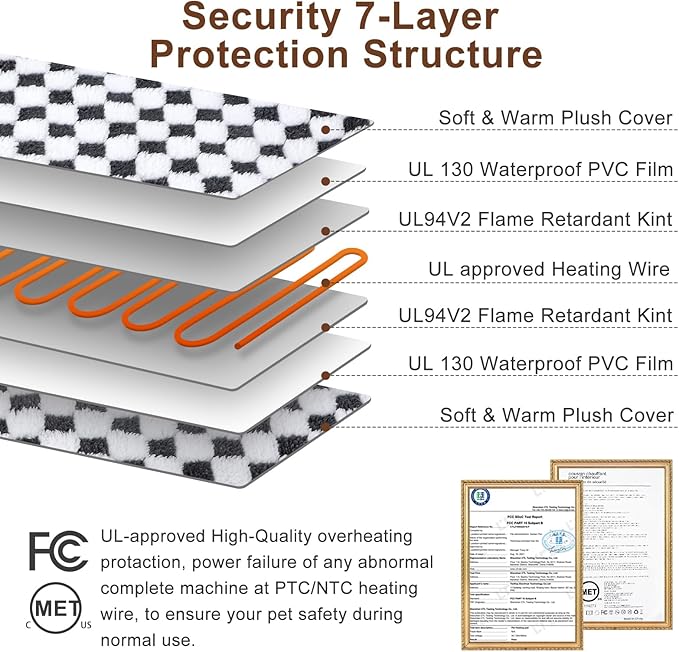 - ❤7 layer Protective Structure: The PVC envelope with waterproof and flame-retardant function. With UL-certified heating wire protect pets from burns. Built-in intelligent temperature sensor with high temperature protection for preventing overheating to protect pet's safety. Don’t let your pets lay on the pet heating pad directly without a plush cover.