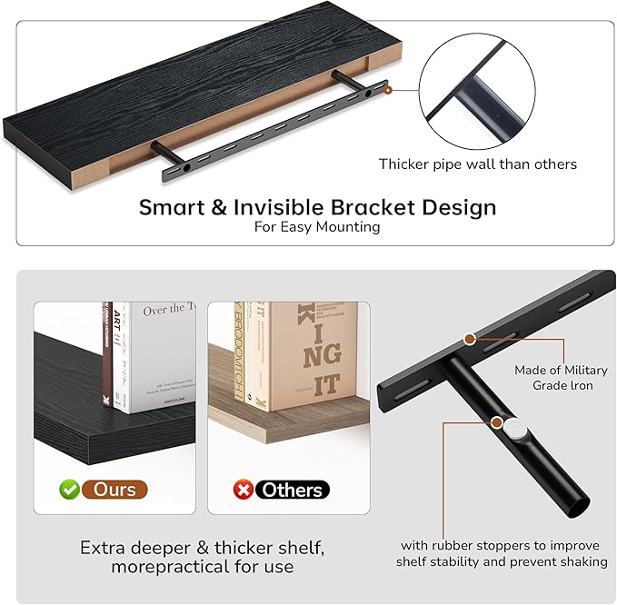 - Easy To Assemble - This floating shelves come with stainless-steel galvanized invisible brackets, toggle bolts for drywall & a simple instruction manual to help you install. The assembly of this wall shelf is very simple, only one boards and some necessary screws and other hardware, and we also have detailed instructions for you to view, you can assemble quickly. Please contact us with any questions or problems at Amazon or Fun Memories.