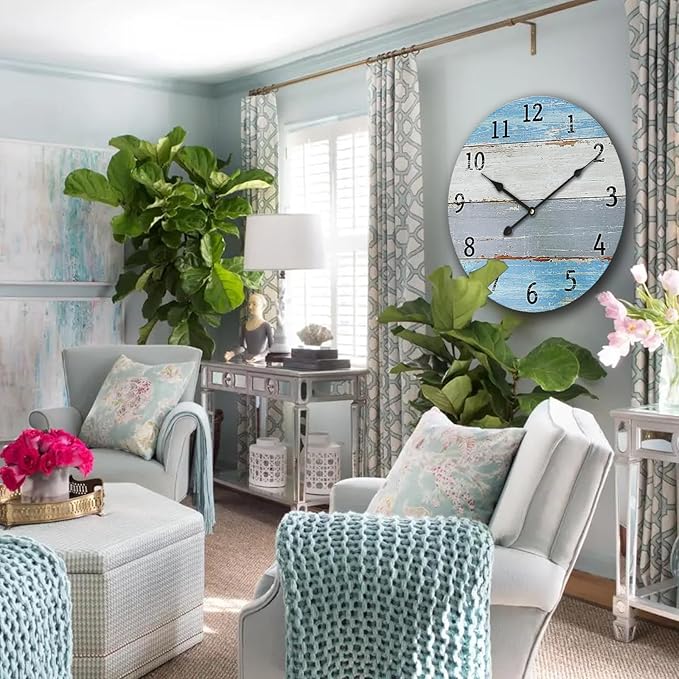Large Wall Clock for Living Room Decor,24 Inch Blue Round Wood Clock for Bedroom,Coastal Vintage Rustic Clock for Farmhouse Kitchen
