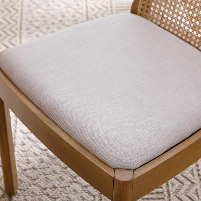 Mid Century Dining Chairs Set of 4, Accent Rattan Linen Fabric Side Chairs Kitchen Chair with Solid Wooden Legs for Living Room Dining Room, Beige