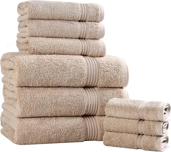 Superior Egyptian Cotton 9-Piece Towel Set, Assorted Towels for Home Bathroom, Guest Bath Decor Essentials, Includes 3 Bath, 3 Hand, 3 Face Towels/Washcloths, Quick Dry, Absorbent - Taupe