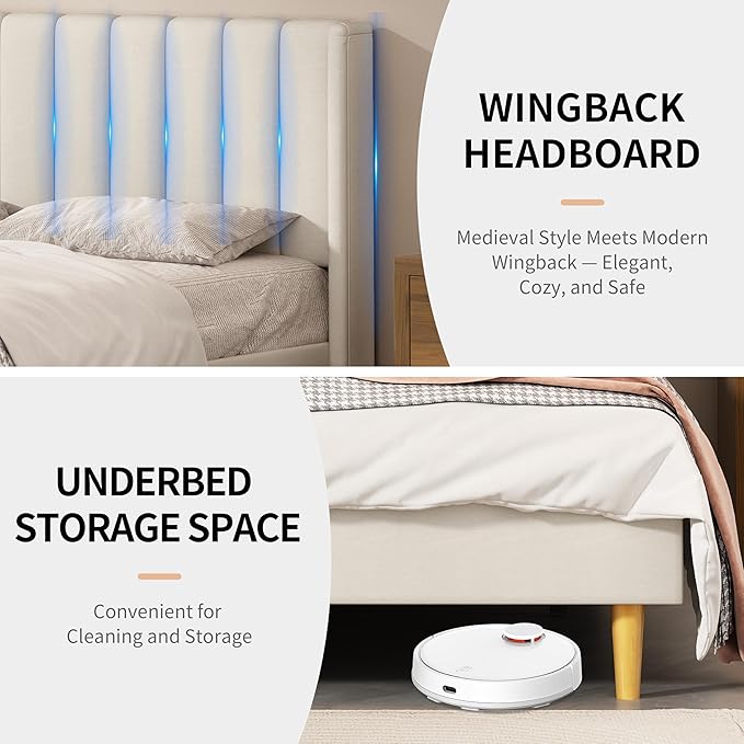 - Elegant Wingback Design: Combining medieval and modern styles, the wingback bed frame queen offers a comfortable backrest for relaxation. It adds an elegant and unique touch to your bedroom decor, enhancing the overall aesthetic appeal of your space