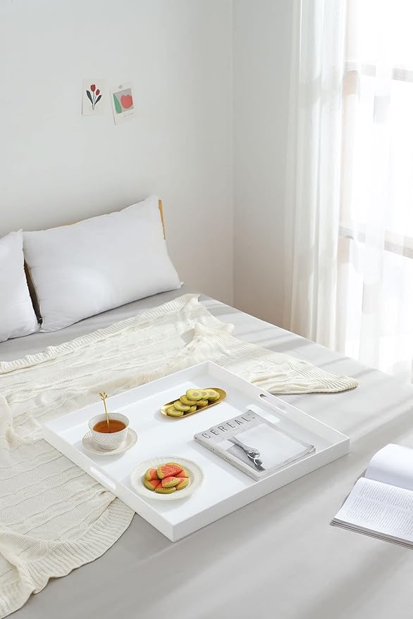 Glossy White Sturdy Acrylic Serving Tray with Handles-24x24Inch-Serving Coffee,Appetizer,Breakfast,Butler-Kitchen Countertop Tray-Makeup Drawer Organizer-Vanity Table,Ottoman Tray-Decorative