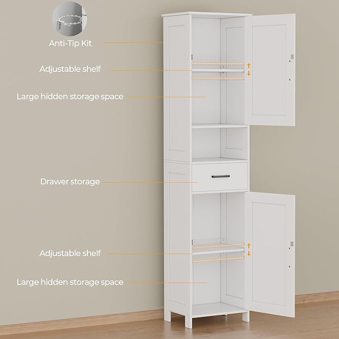 - Multi-functional Storage: The bathroom tall cabinet features two doors and one drawer, offering versatile storage options. You can organize and store towels, toiletries, kitchen utensils, and more, keeping your living space tidy and organized