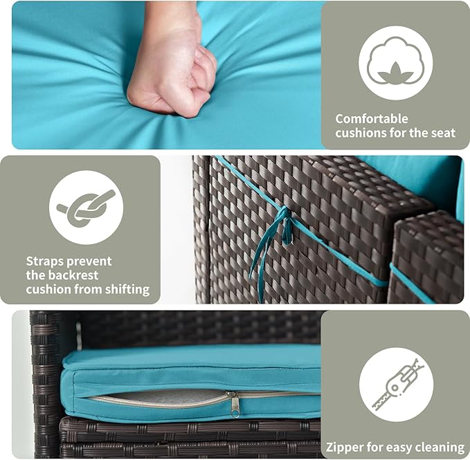 - Durability: This outdoor patio furniture set is crafted with tightly woven, double-strand all weather PE rattan for high strength and a smooth texture, and supported by a sturdy, rust-resistant frame of galvanized steel. This wicker patio furniture is designed to resist weather elements and harsh weather for durability that stands up to the elements.