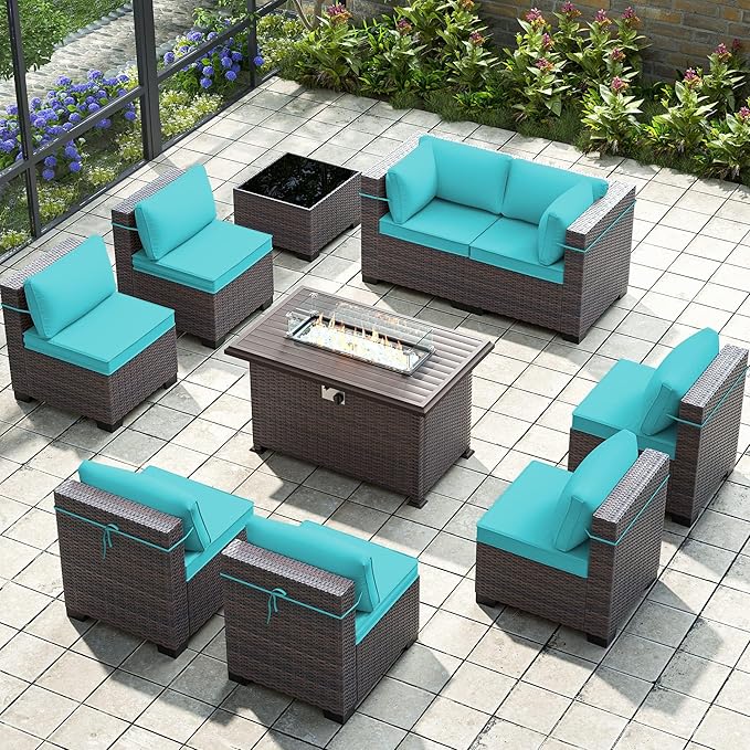 - Easy to clean: The patio set’s tabletop is made of tempered glass, which can be cleaned with a simple wipe and detached for thorough cleaning. The patio couch set has removable covers yet boasts UV, splash, and stain resistance for a lasting, beautiful look. The 10 piece wicker patio conversation set offers flexible layout options for your poolside, backyard, garden, patio, etc.