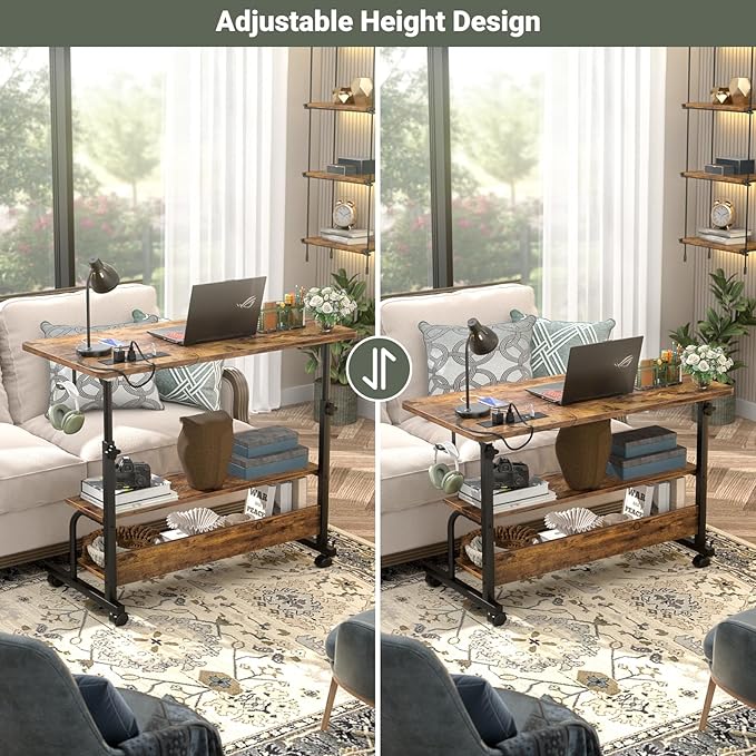 32" Height Adjustable Standing Desk with Power Outlets - Manual Rolling Stand Up Desk with Wheels Small Portable Computer Desk Mobile Laptop Table with Storage Shelves for Home Office, Rustic