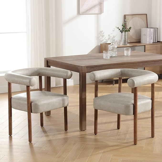 PU Leather Dining Chairs Set of 2, Modern Upholstered Dining Chairs, Curved Backrest Kitchen Dining Room Chairs Accent Chairs Arm Chairs with Natural Wood Legs, Grey