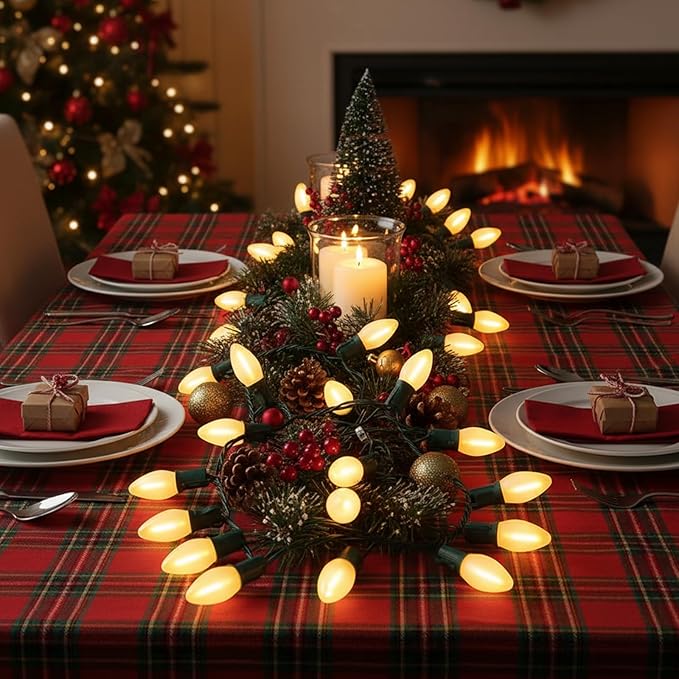 - Innovative Design Frosted Christmas Lights: Christmas lights feature a unique C7 candle-shaped frosted design, adding a touch of elegance to your holiday decor. The frosted white color lights emit a warm, inviting glow that enhances the festive ambiance. The package includes 25 bulbs along with 2 replacement frosted bulbs, ensuring you have everything you need for a delightful lighting experience.