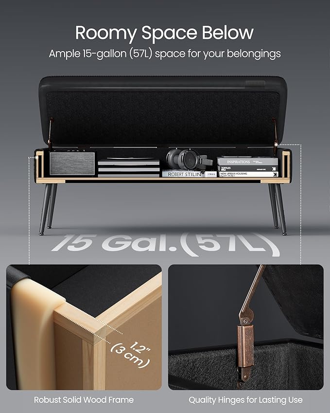 - [Spacious with Safety Hinges] With a 15 gal. (57L) capacity, our ottoman bench neatly stows everything from your blankets and pillows to clothes. The dual safety hinges on the lid promise smooth, safe operation and efficient access to your items