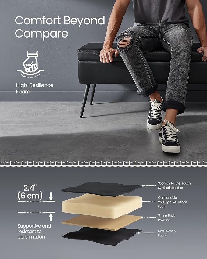- [Comfort Meets Convenience] Glide your hand over the smooth, easy-to-clean cover, then sink into the 2.4" (6 cm) thick, supportive 25D high-resilience foam that resists deformation. This storage bench offers both a cozy seat and effortless upkeep