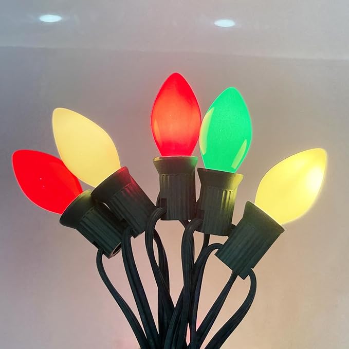 - Vintage Christmas Lights Decor: These traditional christmas string lights feature C7 E12 red green white bulbs that provide a nice, soft red green white glow that will be eye-catching during your Christmas outdoor decorations.These incandescent light bulbs have an old-fashioned appearance while featuring a ceramic casing that makes them look classy and elegant. It will be a great choice for creating your little outdoor paradise