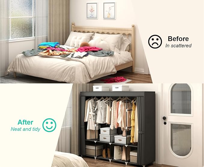 - ššš«š š šš„šØš¬šš šššØš«šš š: This portable closet wardrobe consists of 4 movable hanging rods for clothes, jackets, dresses, coats; 8 storage shelves for folded clothes, bags, hats, accessories, underwear and socks. It will increase space usage of your bedroom.
