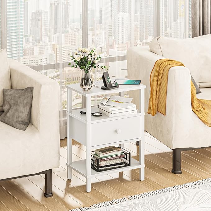 Lerliuo Nightstand with Charging Station and USB Ports, 3-Tier Storage End Table with Drawer Shelf, Night Stand for Small Spaces, Wood Bedside Table for Living Room, Bedroom - Elegant White