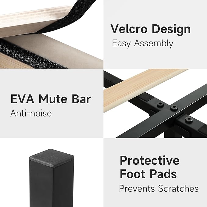 - 【Solid and noiseless 】The bed frame consists of a heavy metal frame and 12 solid wood slats, Headboard in the middle of the rod to make the bed frame more stable, eight support points can support up to 1000 pounds of weight, effectively extend the life of the mattress. Solid wood slats with Velcro and EVA mute bar, effectively avoid the noise caused by the friction between wood and metal frame, will not squeak, ensure your sleep quality.