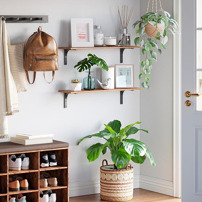 DINZI LVJ Long Wall Shelves, 23.6 Inch Wall Mounted Shelves Set of 2, Easy-to-Install, Wall Storage Ledges with Sturdy Metal Brackets for Living Room, Bathroom, Bedroom, Kitchen, Rustic Brown