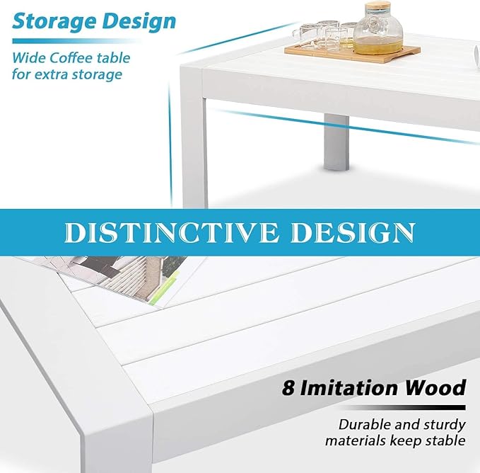 - DURABLE IMITATION WOOD TABLE: The modern aluminum outdoor patio furniture coffee table is made of 8-piece imitation wood, which can not only enhance the natural visual enjoyment but also has the characteristics of excellent moisture-proof and water-resistance. Different from tempered glass, the imitation wood will not crack suddenly due to high temperature.
