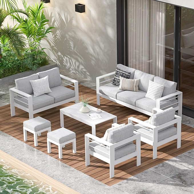 - SECTIONAL FLEXIBILITY- Including a high bar table, a single-, a double-, a three corner sofa, and 2 ottomans, this metal outdoor patio furniture set’s sectional design enables flexibility for versatile configurations to fit your specific needs. The aluminum furniture will blend seamlessly into any arrangement, making this the perfect conversation spot on your patio.