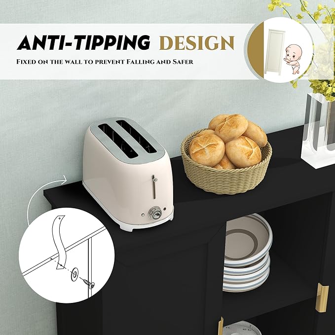 - Excellent Quality❥❥❥This buffet cabinet black is made of high-quality MDF wood and comes with metal handles. The structure of the living room cabinet is sturdy and stable, ensuring long-term daily use. The cabinet door is specially designed with a magnetic suction device for easy opening and closing of the cabinet door. At the same time, for safety reasons, an anti tipping design has been added to the back of the black buffet cabinet with storage, which can fix the cabinet to the wall for safer use.