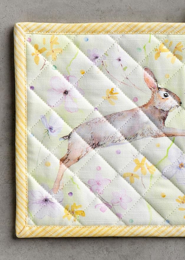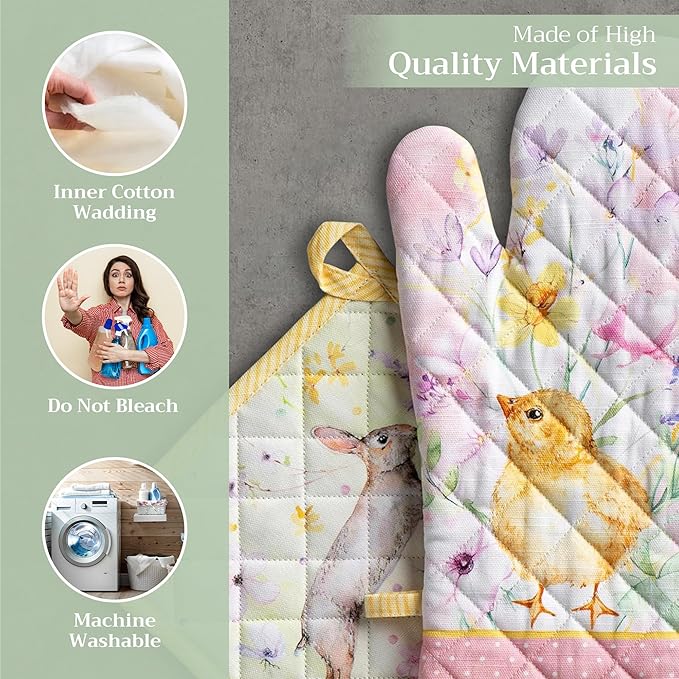 Maison d' Hermine 100% Cotton Oven Mitt & Pot Holder Set (7.5"x13" & 8"x8") Heat Resistant BBQ Cooking Gloves with Loop, Baking, Grilling, Kitchen, Handling Hot Pans Spring/Summer (Easter Zest)
