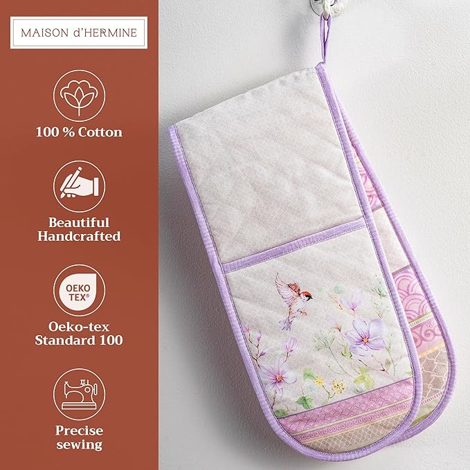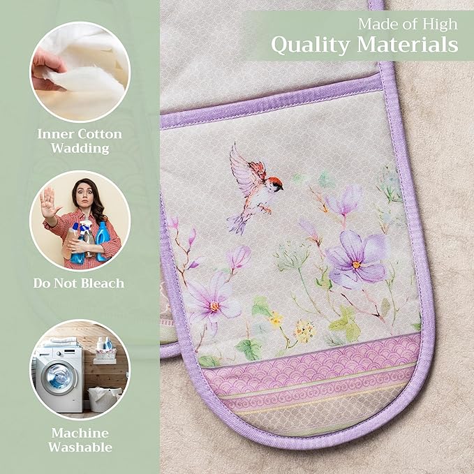 Maison d' Hermine Double Oven Mitts 100% Cotton 7"x35" Double Oven Mitt Heat Resistant BBQ Cooking Gloves with Loop, Baking, Grilling, Home, Kitchen, Handling Hot Pan Spring Summer (Magnolia Mornings)