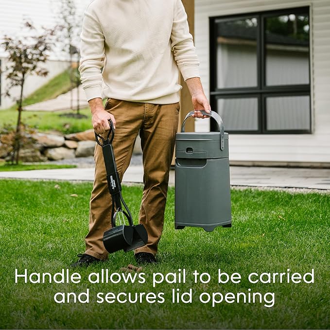 - OUTDOOR USE: Durable, rugged plastic with UV protection. Lightweight portable dog poop disposal system to help you keep your lawn and garden healthy and clean. Reduce plastic dog poop bags by direct scooping into the pail. Not for extreme weather. Do not use below : -10 °C / 14 °F