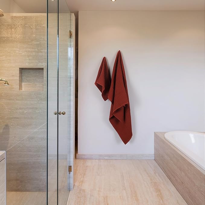 - PACKAGE CONTENT: Each Püskül Textile stunning brick red color waffle towel set contains 4 pieces; 2 Pieces luxurious waffle bath towels and 2 Pieces coordinating waffle hand towels