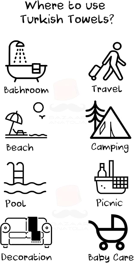 - Versatile: There are many ways to use Turkish Beach Towel. You can use the turkish towel as a scarf on the outside, shawl on the terminal, travel blanket on an airplane, oversized beach towel when you get off the plane and go to the beach. Quite useful as a travel beach towel. Or you can use as a bathroom towels, yoga mat towel, pool towel or a throw blanket in your house.
