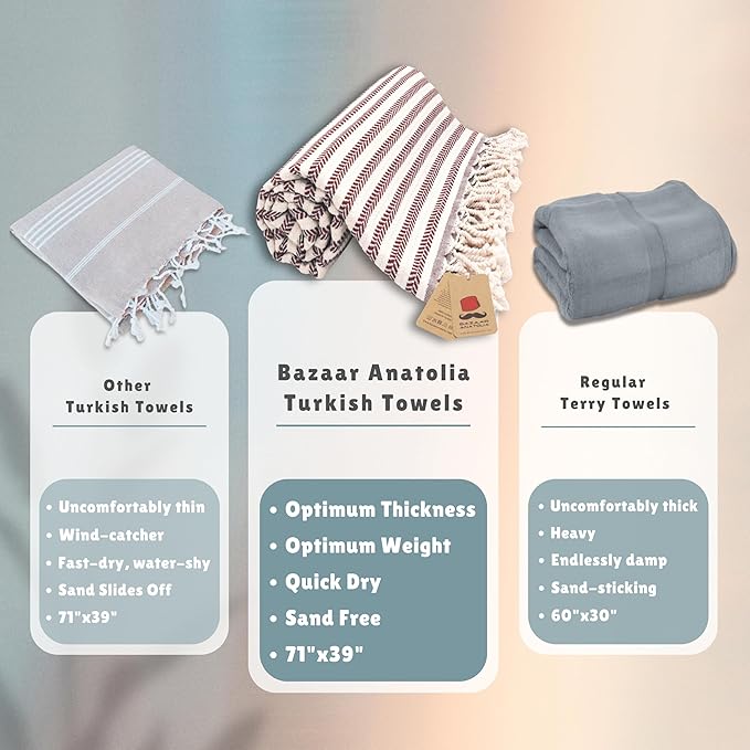 - Versatile: There are many ways to use Turkish Beach Towel. You can use the turkish towel as a scarf on the outside, shawl on the terminal, travel blanket on an airplane, oversized beach towel when you get off the plane and go to the beach. Quite useful as a travel beach towel. Or you can use as a bathroom towels, yoga mat towel, pool towel or a throw blanket in your house.