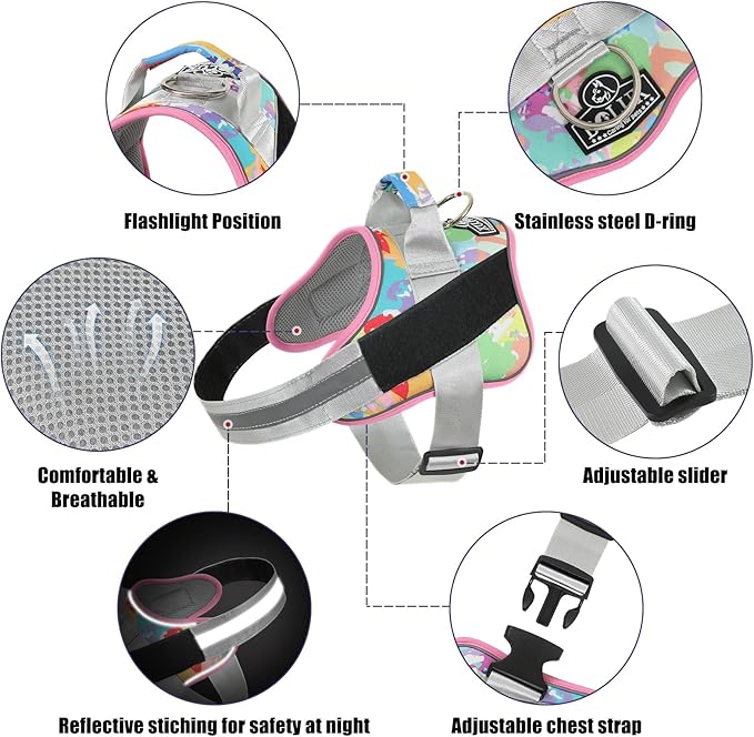 - OUTDOOR HEALTHY: Puppy no pull dog harness with reflective straps to ensure your dog is highly visible and keep dogs safe at night. You can connect the dog leash on the D-ring and with handle is easy to control on crowded streets. The high-end pet harness is perfect for daily walking, running, hiking, training, hunting, outdoor adventure and more!