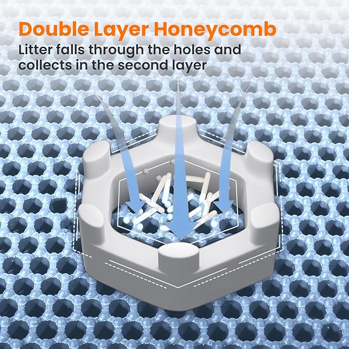 - Double-Layer Honeycomb Structure: The top layer features holes that capture all kinds of litter, allowing it to fall through to the waterproof bottom layer for easy cleanup. Simply pick up the kitty litter mat, pour the trapped litter back into the box, and reuse it—mess-free and effortless. This clever design minimizes litter waste and streamlines your daily cleaning routine.