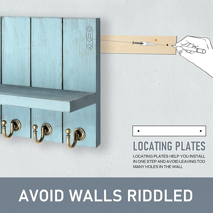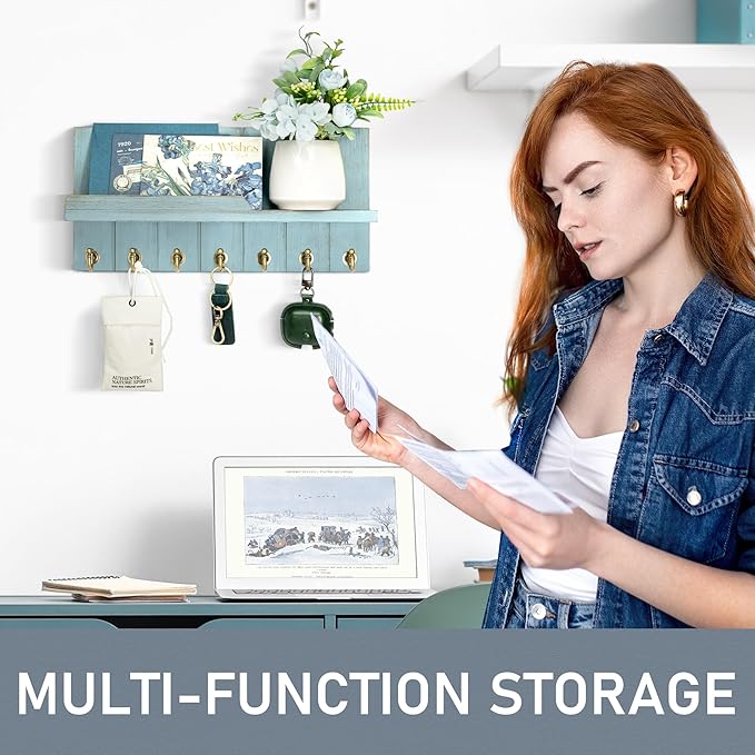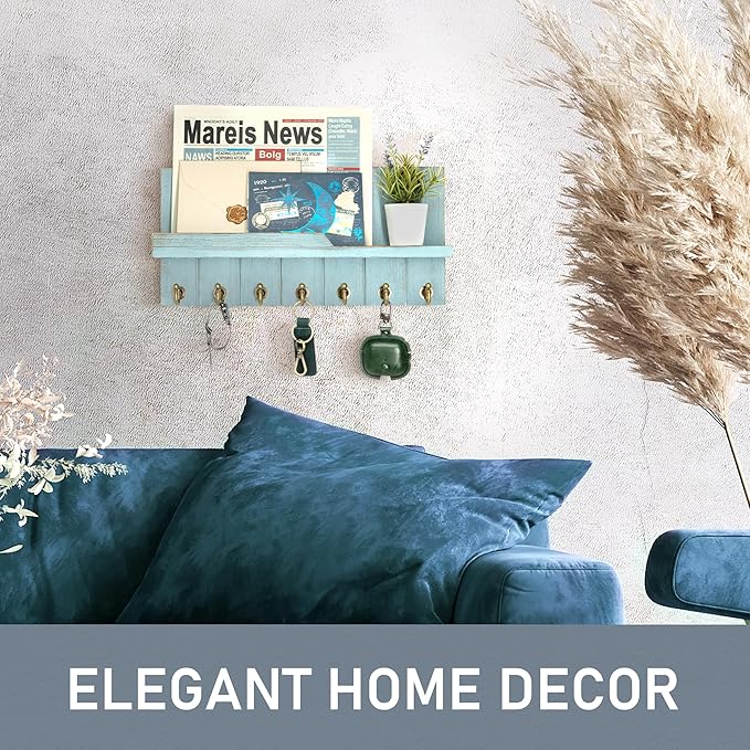 Rebee Vision Decorative Key Holder Wall Mount - Modern Farmhouse Key and Mail Holder for Wall with Shelf and 7 Key Hooks for Mail Organizer - Mid Century Aesthetic Room Decor (Distressed Blue)