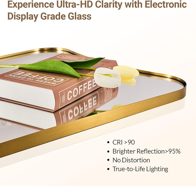 - 【High-Definition Clarity】: This bathroom vanity mirror features a crystal-clear reflection using high-quality silver glass, offering true-to-life images without distortion. The robust construction of our mirror with gold frame ensures its longevity, while the easy-to-clean surface keeps your reflection pristine