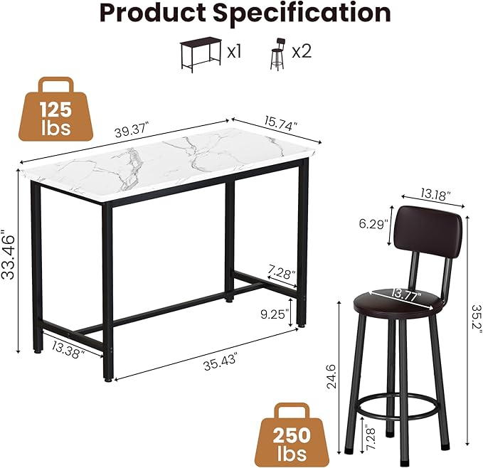 - 【BAR TABLE AND CHAIRS SET】Our dining table and chairs are set for 2 is made of MDF and metal frame, The chair is made of PU leather with a curved backrest, an ergonomic design. Table Weight: 200 lbs Chair Weight: 250 lbs