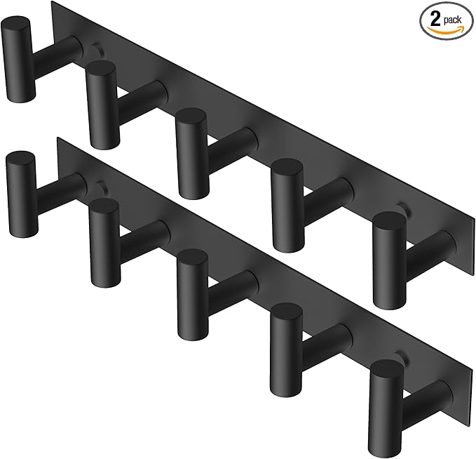 PMMASTO Coat Rack Wall Mounted, 5 "T Shaped Wall Hooks for Hanging, Heavy Duty Stainless Steel Coat Hook Rail for Hat Towel Robes in Bathroom Kitchen Mudroom Entryway (Black, 2 Pack)