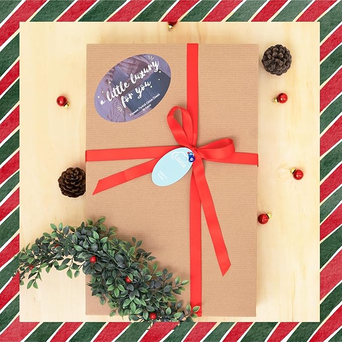 - A BEAUTIFUL AND PRACTICAL PRESENT: Gorgeously presented in a beautifully, understated craft box packing with ribbon, a decorative bead, and stickers. This thoughtfully curated set includes a large bath towel measuring 30” x 60”, a hand towel sized at 16” x 30”, and two washcloths measuring 12” x 12”.